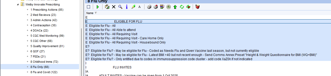 Navigate to the reports Welby Innovate Prescribing > 8 Flu Only or 8 Flu and Covid depending on whether you are offering Covid vaccinations along with flu vaccinations for this campaign.