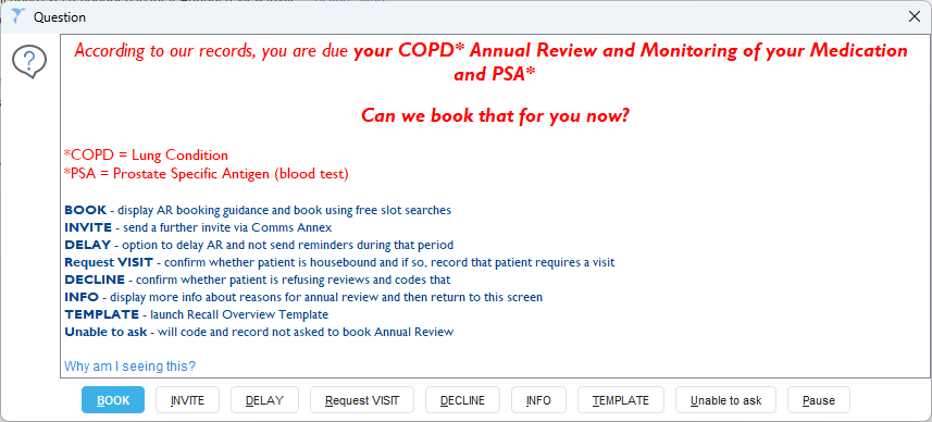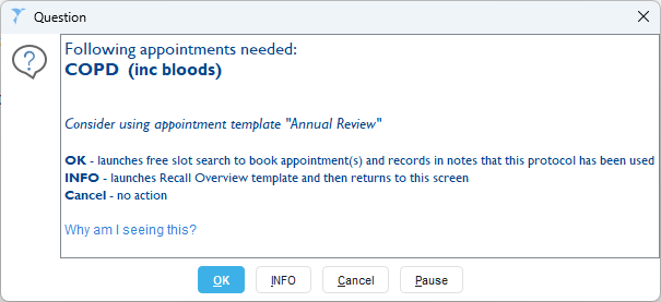 The Booking Prompt will work out which prompt to display, e.g. if a patient needs monitoring blood tests and their annual review, it will only prompt you to book the annual review. Occasionally it will display more than one prompt, e.g. if a patient needs an annual review booking and a follow up appointment with a GP.