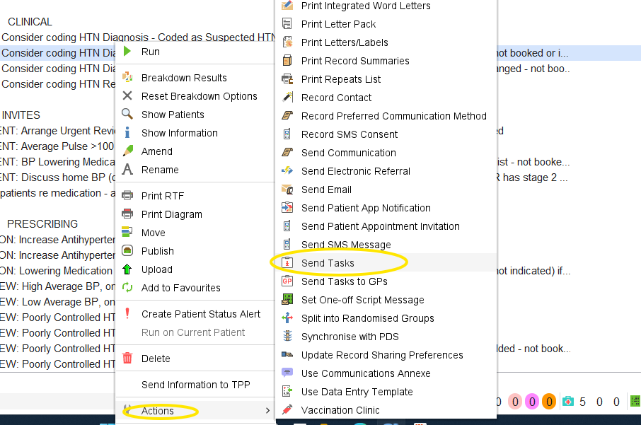 - To carry out an action in SystmOne on all the patients in a report, select the report to highlight it, right click on the report, then choose Actions from the drop down list that appears, then select Send tasks.