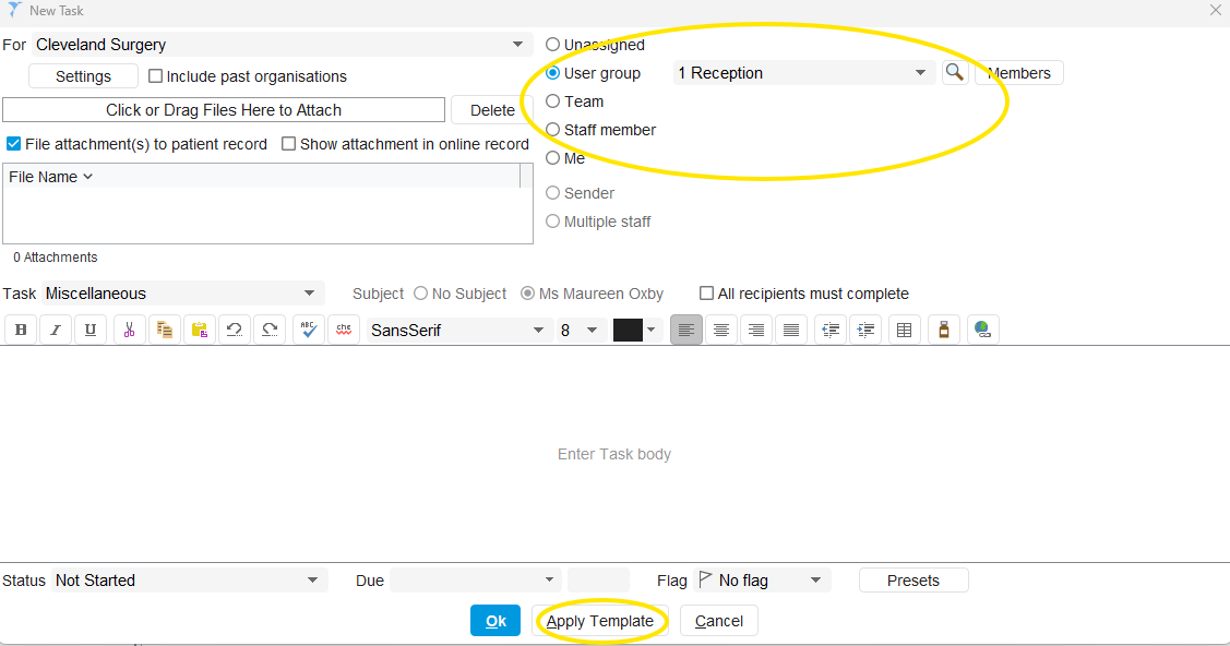 - A New task box will appear on the screen, at this point you can either choose a template if you have an appropriate one set up, or you can free type the task into the main body of the task and use the User group or staff member tick boxes to send the tasks to the correct people before sending.