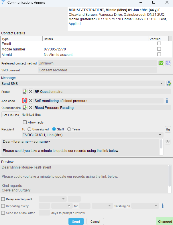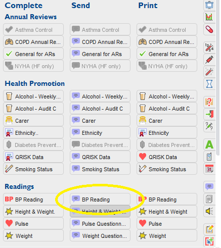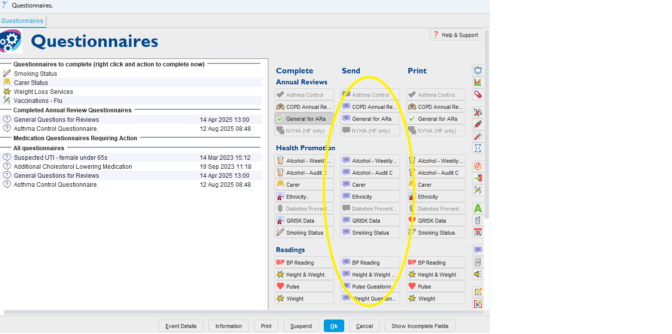 - Select the Questionnaire you wish to send, we will use the BP readings for this example.