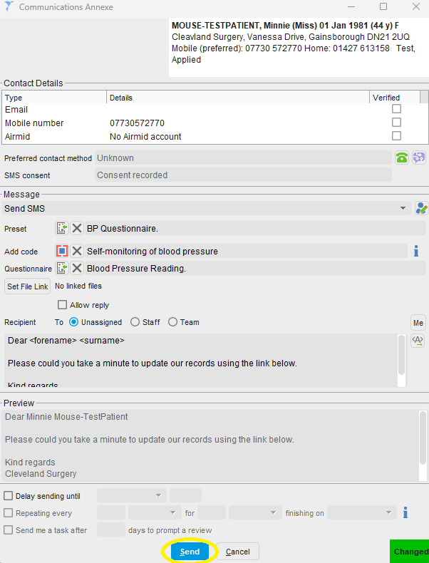 - Once you have chosen the recipient, click Send and this will sent to the patient.