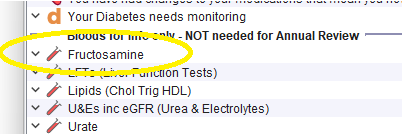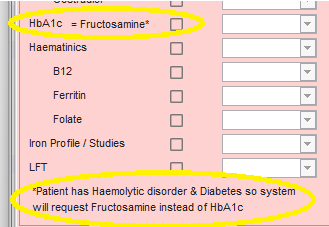 Some patients have a Haemolytic Disorder, which mean labs can't process HbA1c tests for them. Patients with a Haemolytic Disorder, or with a Haemoglobin Variant which may lead to a Haemolytic Disorder, should have a Fructosamine or Fasting Glucose blood test as an alternative to an HbA1c test. If patients are coded in this way, the system will request the appropriate alternative.