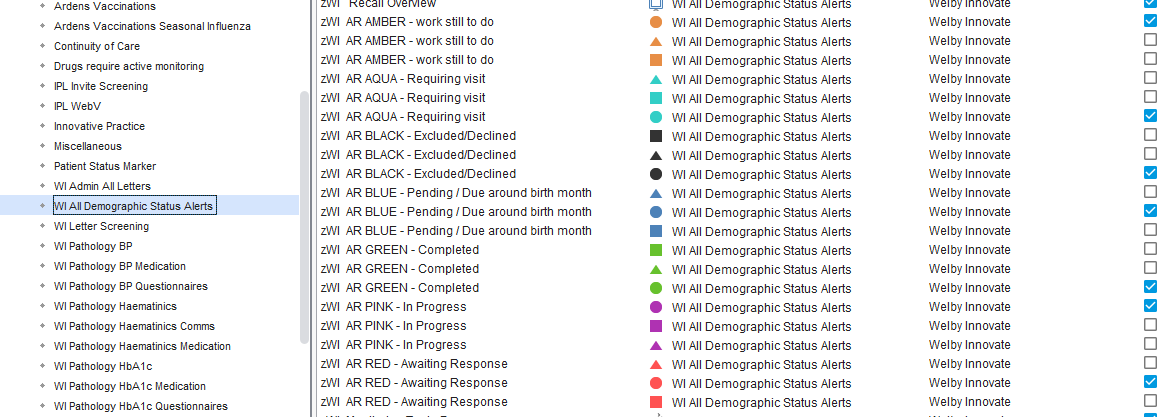 Go to the folder WI All Demographic Status Alerts, then untick the box next to the shapes you don't want to display. In the example below, all the status alerts for triangles and squares have been disabled, leaving the circles enabled and therefore showing on the demographics box.