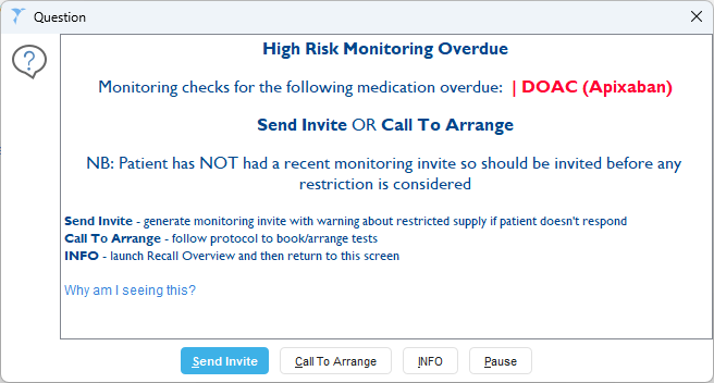 - If a patient hasn’t recently been invited, protocols will advise inviting rather than restricting access to medication, e.g.