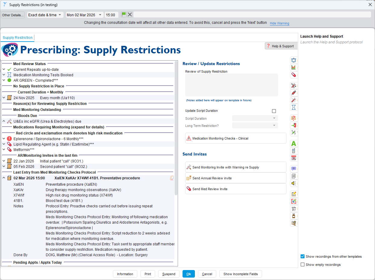 The new template displays reasons for restriction and has options to record notes and update the script duration, including recording if the patient has a long term supply restriction. Here’s an example: